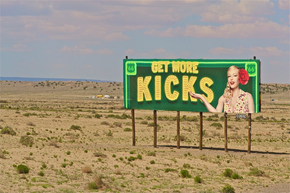 I wish I could honestly say that I don’t remember the expression “get more kicks on Route 66” but I’d be lying. I’m surprised that the sign remains in such good condition in that wasteland. Billboards must have been made very sturdy in the last century!